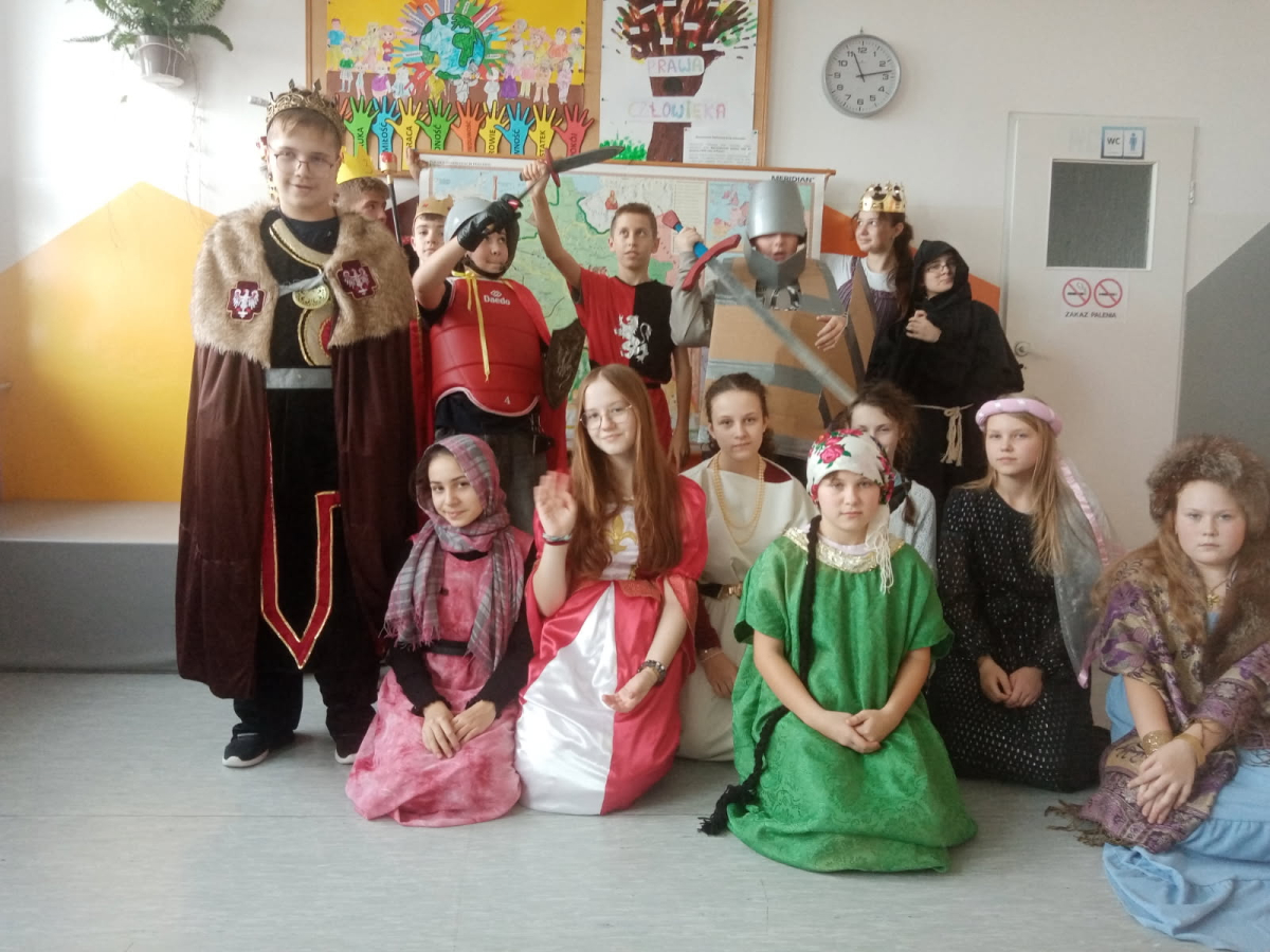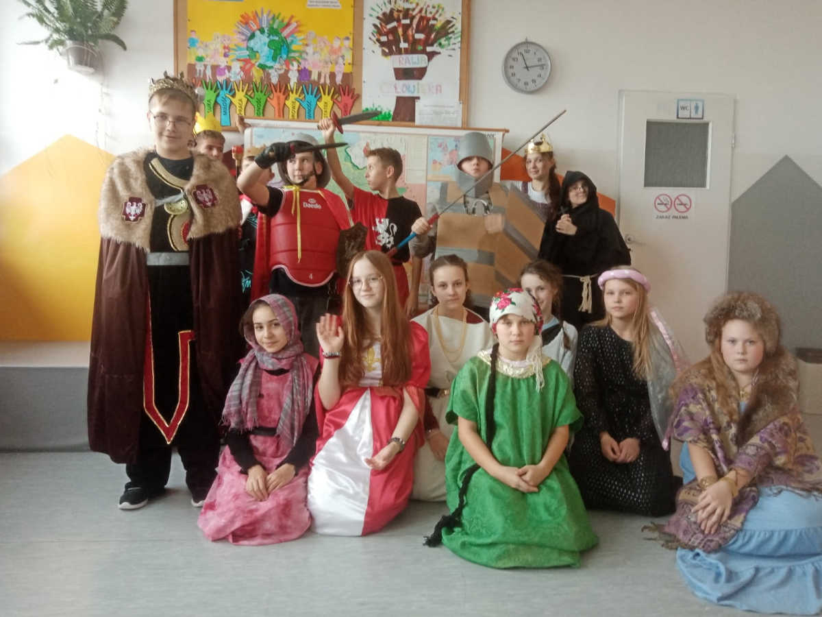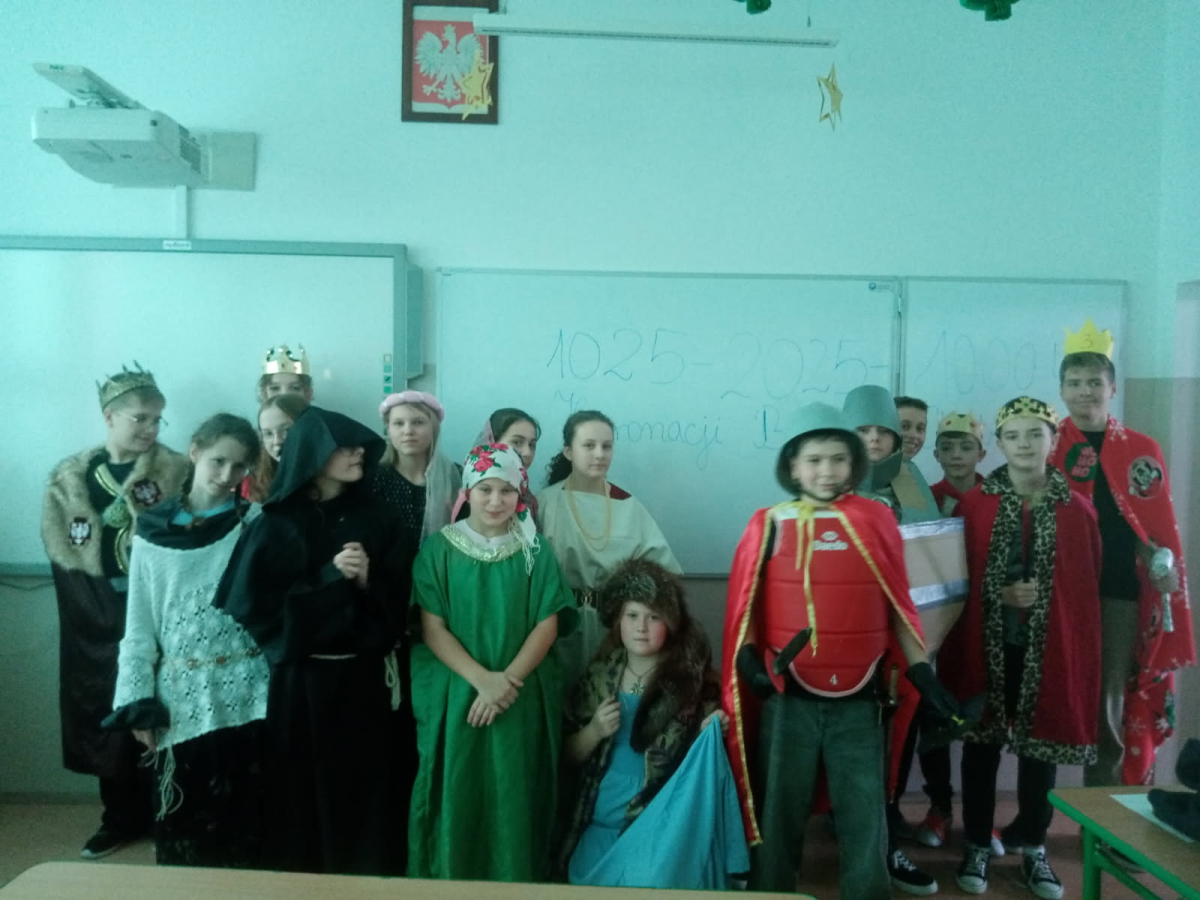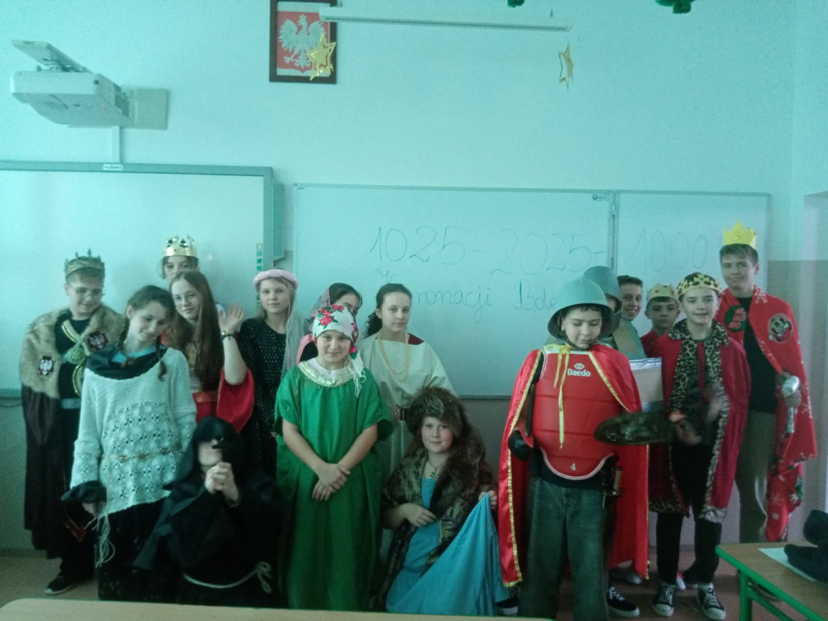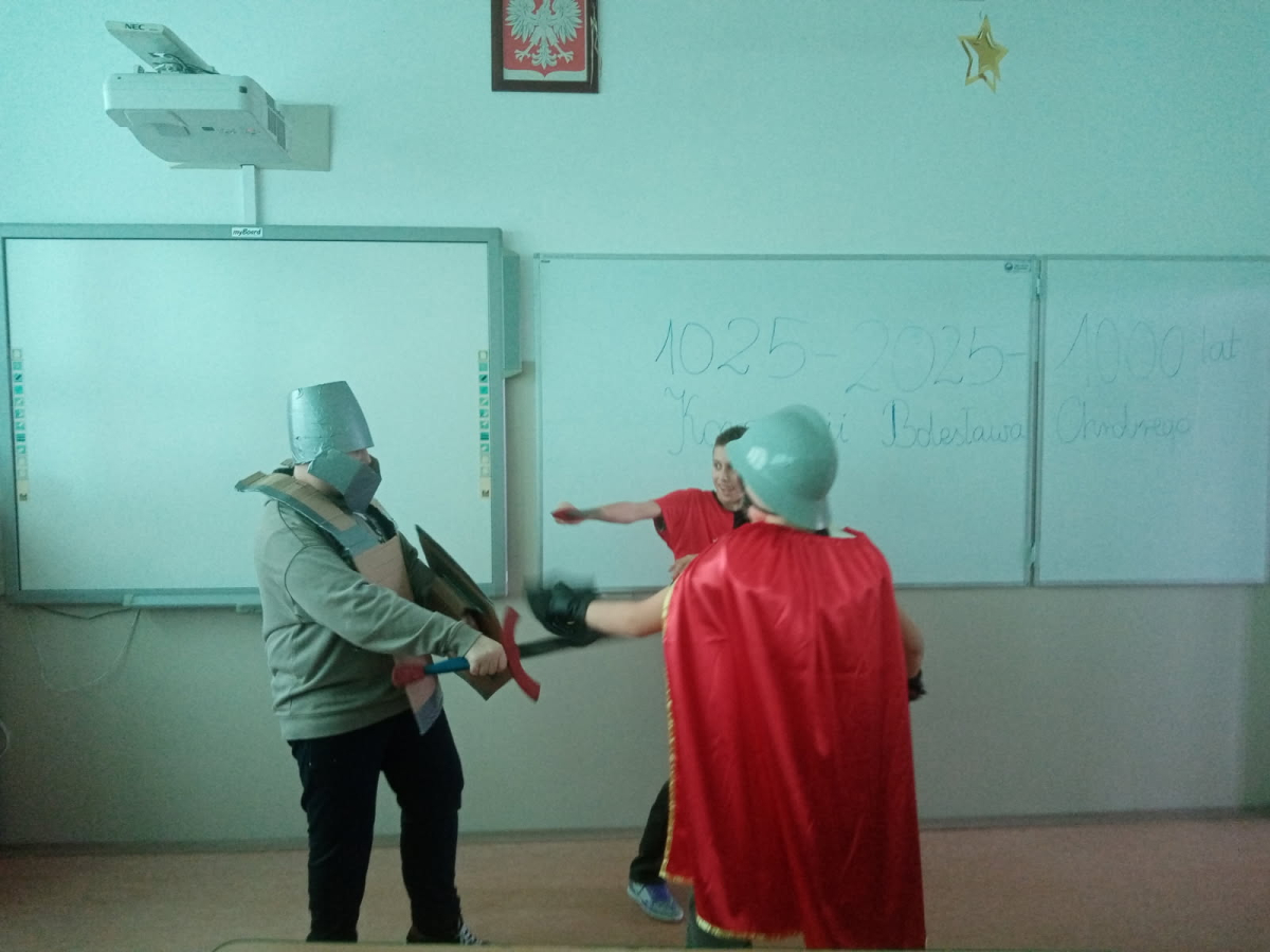 Drzewo to stało się symbolem oraz punktem wyjścia do rozmów o początkach państwa polskiego, tradycji i odpowiedzialności za dziedzictwo narodowe. Do tej idei nawiązywaliśmy również podczas lekcji historii. W lekcji aktywnie uczestniczyli uczniowie klasy VI, którzy przygotowali stroje inspirowane czasami Bolesława Chrobrego. Przebrani za mieszkańców wczesnośredniowiecznej Polski, wojów i możnych, przenieśli nas w czasy pierwszego króla. Dzięki temu uczniowie mogli lepiej zrozumieć realia epoki i zobaczyć, jak mogło wyglądać życie sprzed tysiąca lat. Taka forma nauki pokazała, że historia może być ciekawa, angażująca i pełna dobrej zabawy.
