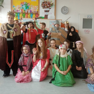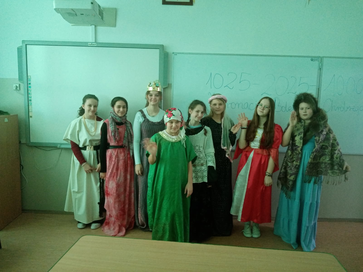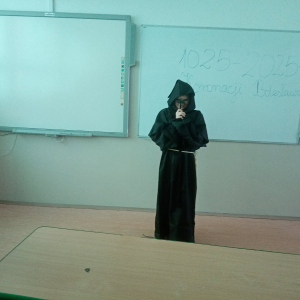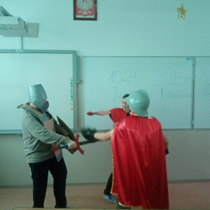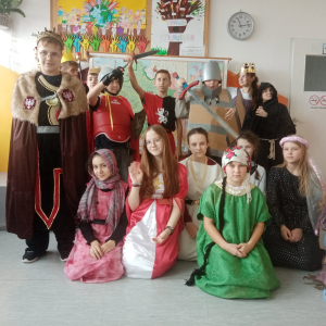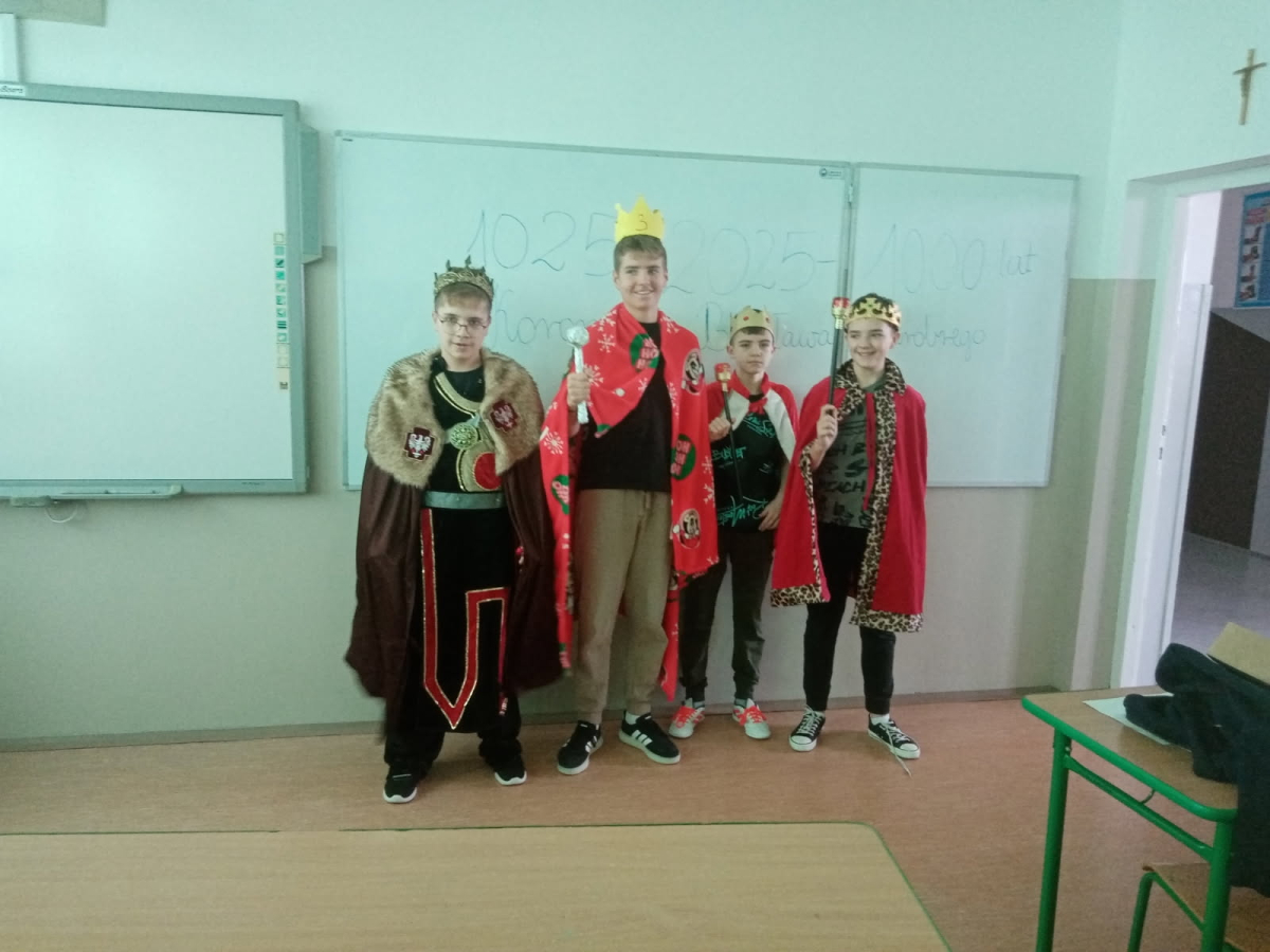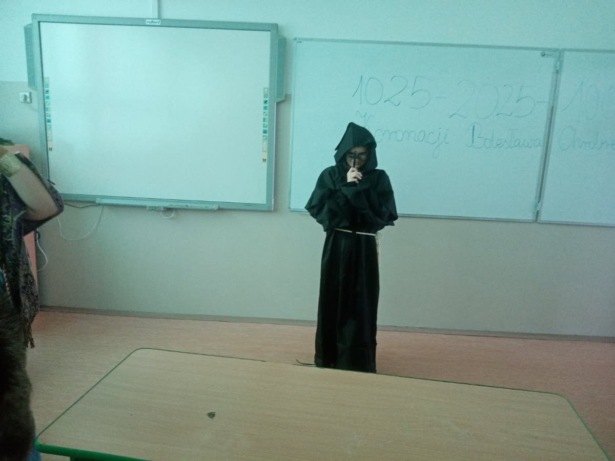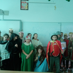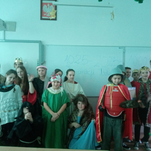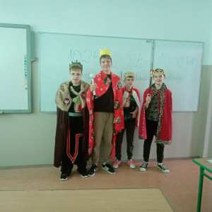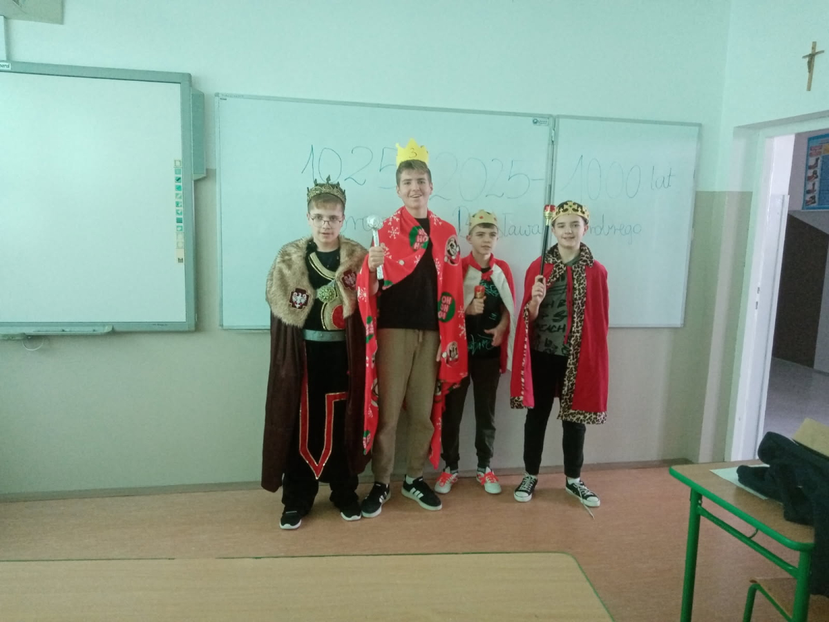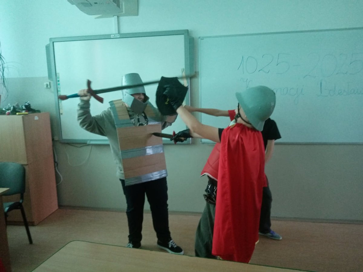 Drzewo to stało się symbolem oraz punktem wyjścia do rozmów o początkach państwa polskiego, tradycji i odpowiedzialności za dziedzictwo narodowe. Do tej idei nawiązywaliśmy również podczas lekcji historii. W lekcji aktywnie uczestniczyli uczniowie klasy VI, którzy przygotowali stroje inspirowane czasami Bolesława Chrobrego. Przebrani za mieszkańców wczesnośredniowiecznej Polski, wojów i możnych, przenieśli nas w czasy pierwszego króla. Dzięki temu uczniowie mogli lepiej zrozumieć realia epoki i zobaczyć, jak mogło wyglądać życie sprzed tysiąca lat. Taka forma nauki pokazała, że historia może być ciekawa, angażująca i pełna dobrej zabawy.