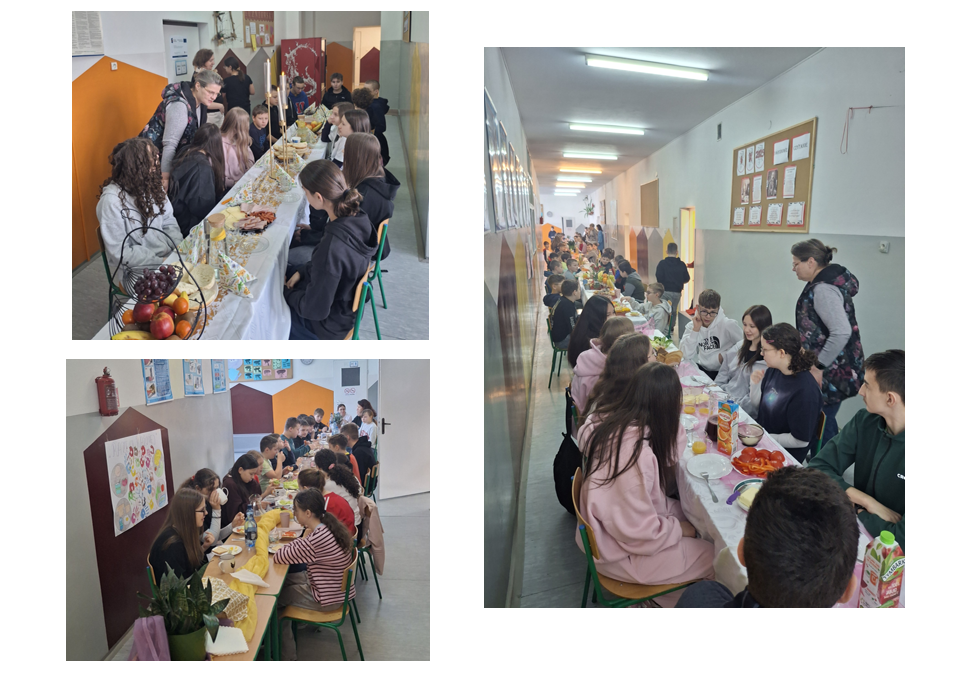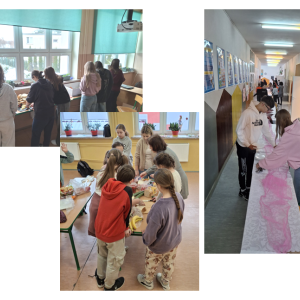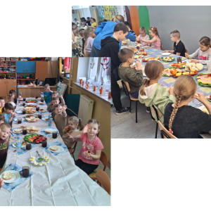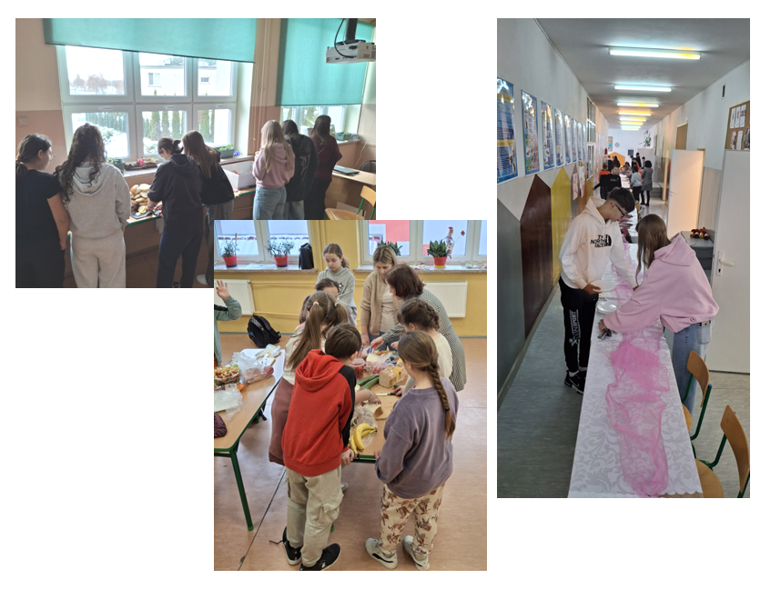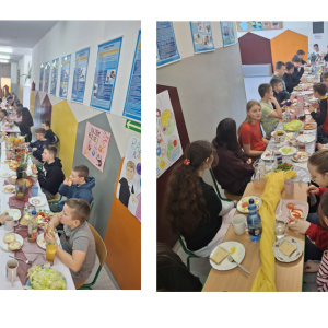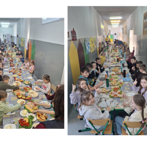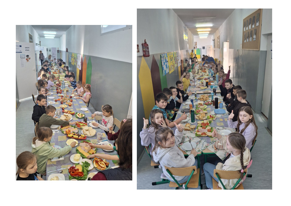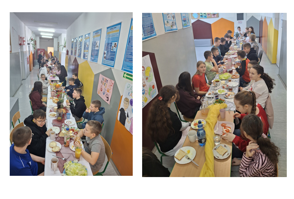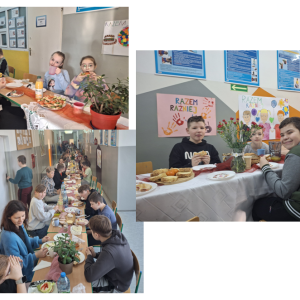 Obchody rozpoczęliśmy od wspólnego śniadania szkolnego, przygotowanego przez uczniów wraz z wychowawcami. Na stołach pojawiły się zdrowe i kolorowe przekąski, kanapki, owoce oraz napoje. Była to nie tylko okazja do wspólnego posiłku, ale przede wszystkim do rozmowy, integracji i budowania przyjaznej atmosfery. Uczniowie podkreślali, że wspólne jedzenie sprzyja otwartości i poczuciu wspólnoty.
