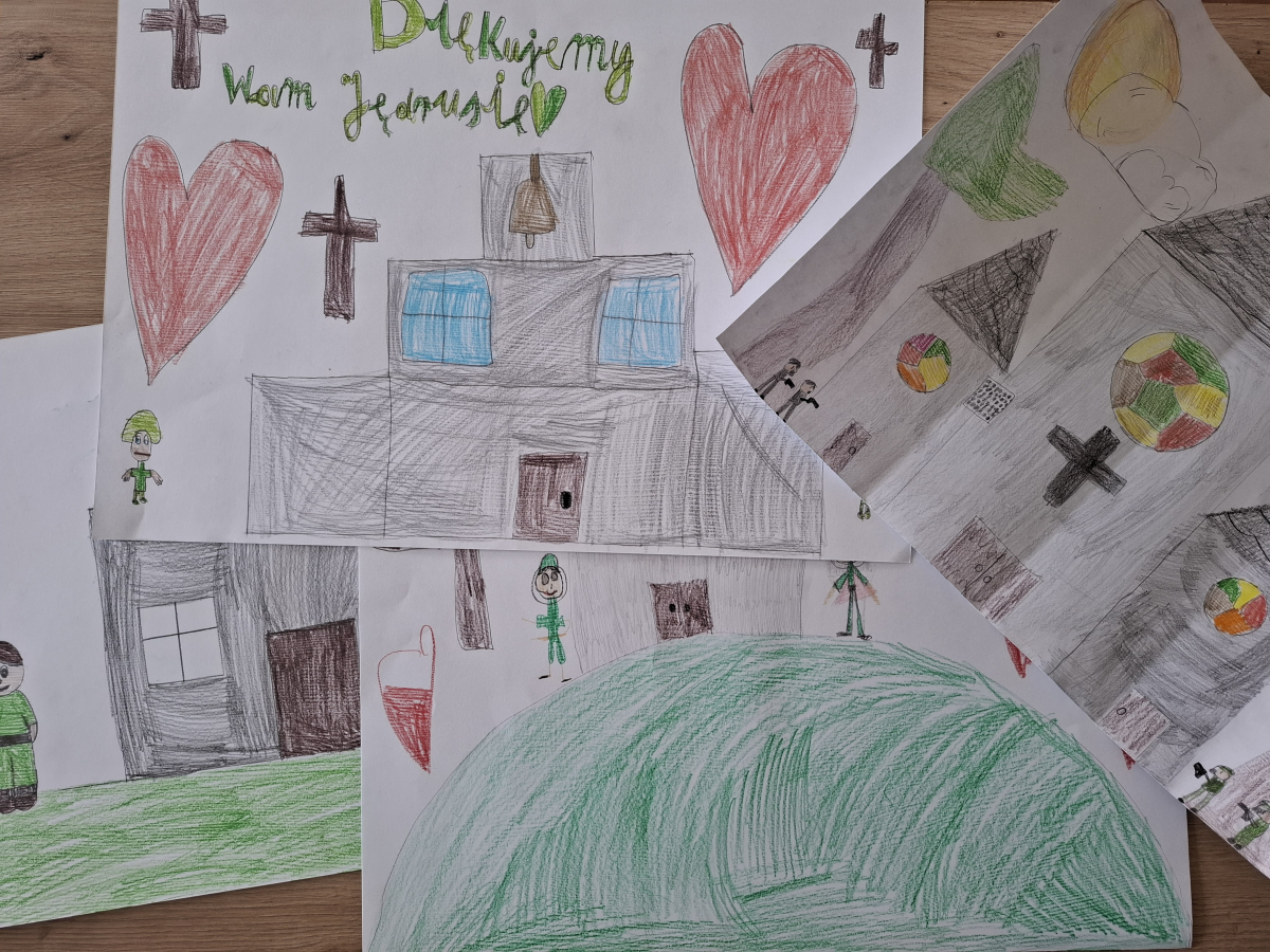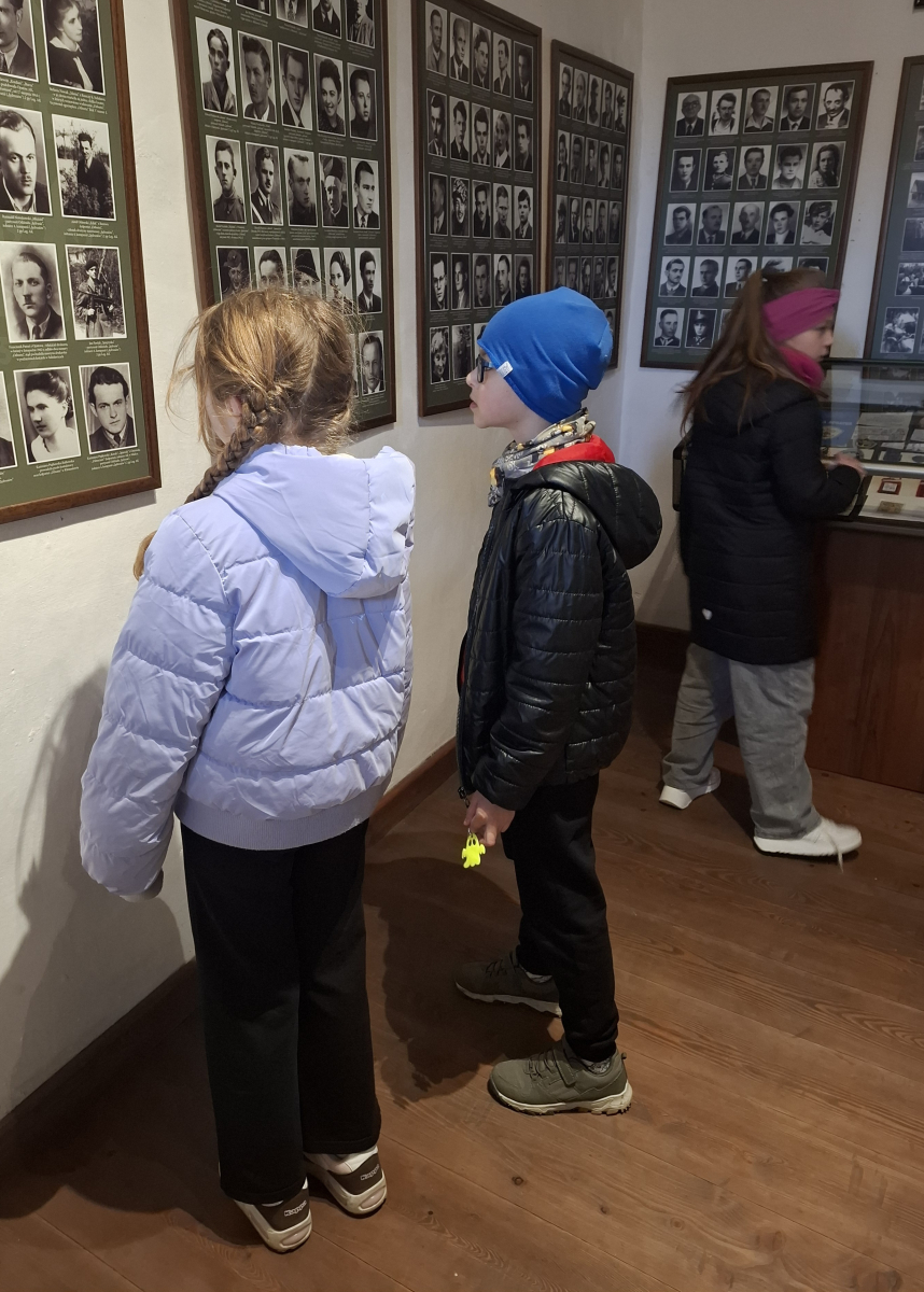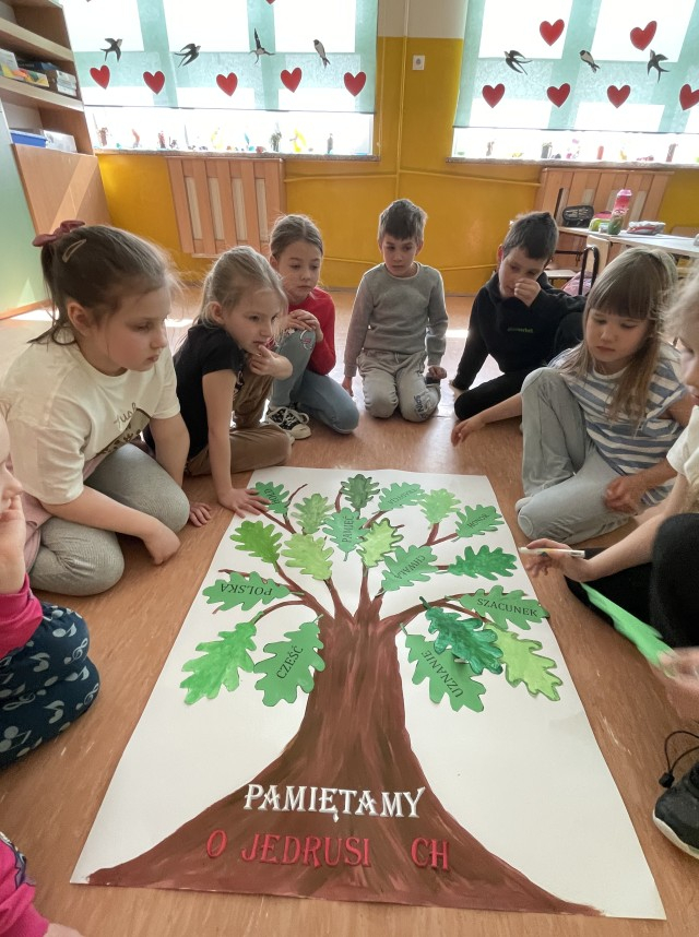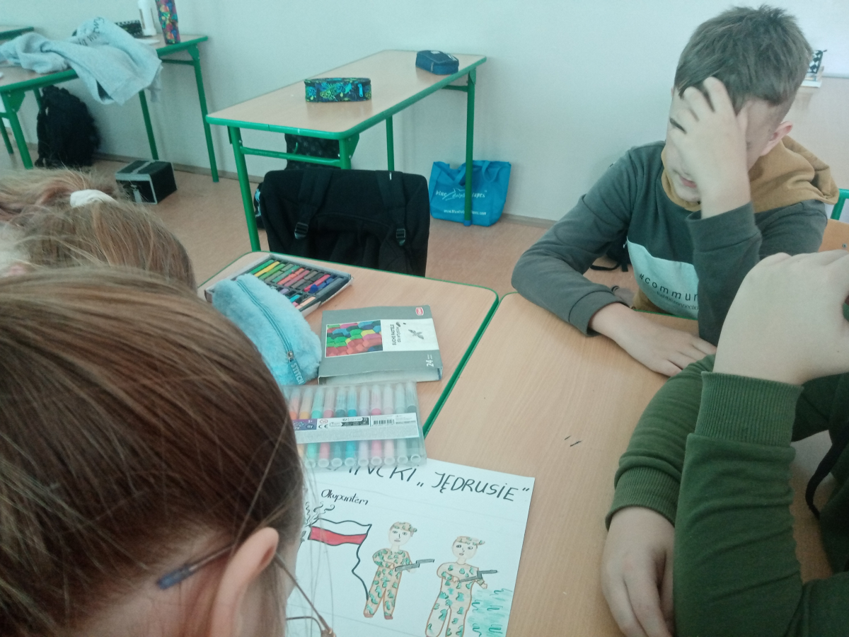 Uczniowie z klas 1-3 z dużym zaangażowaniem podejmowali działania przybliżające historię i wartości patrona. Dzieci odwiedziły Izbę Pamięci oraz grób „Jędrusiów” na cmentarzu w Sulisławicach, poznając losy bohaterów i oddając im należny hołd. Obejrzały również film poświęcony oddziałowi, który pomógł lepiej zrozumieć realia tamtych czasów.