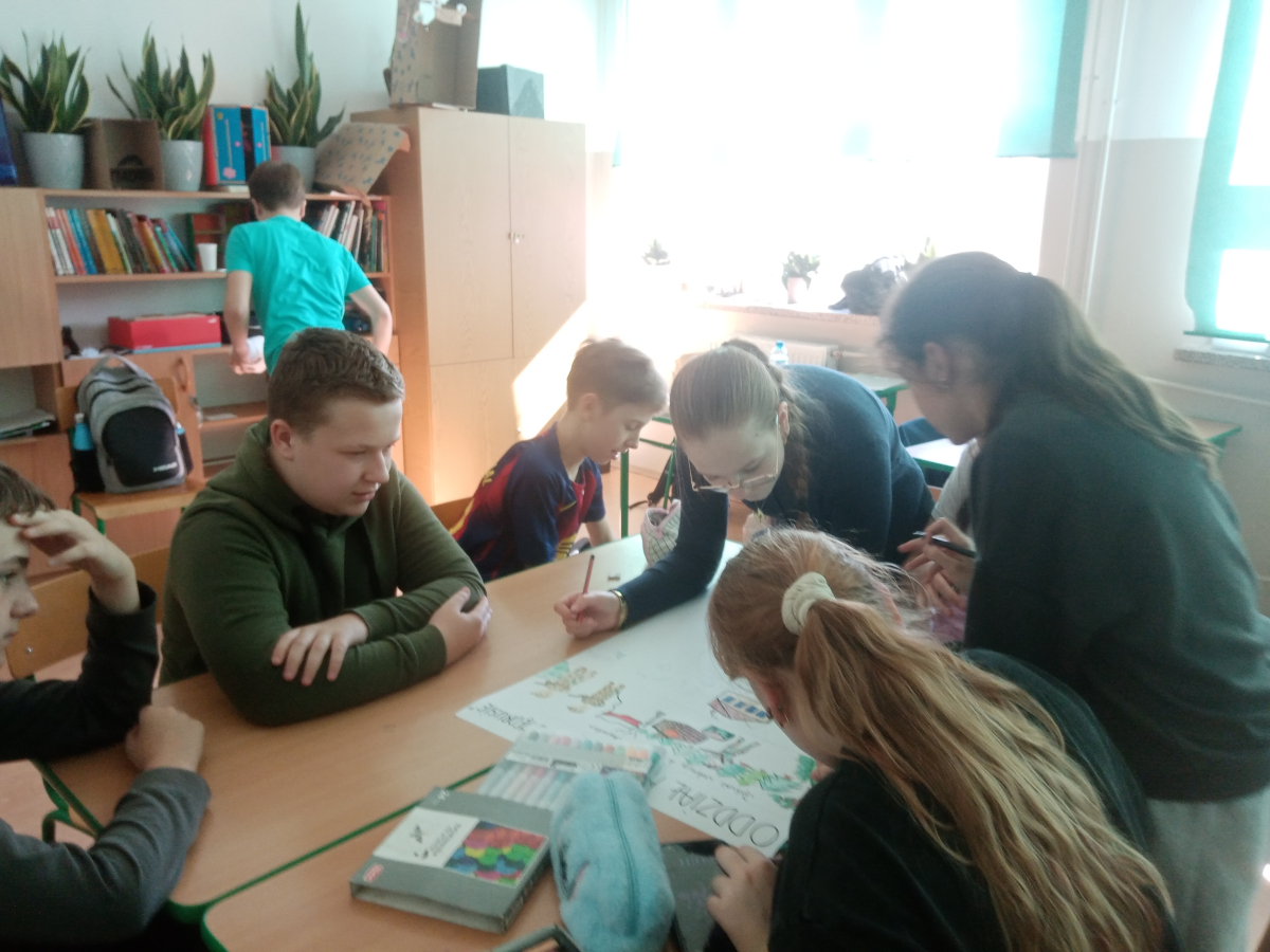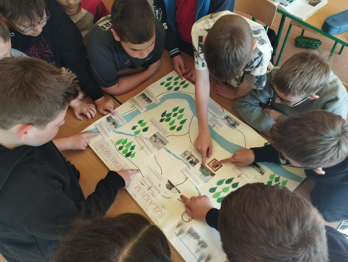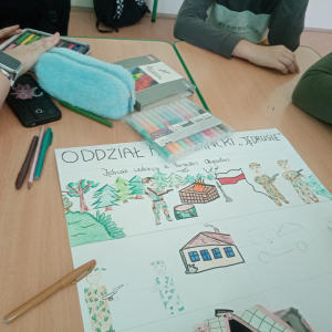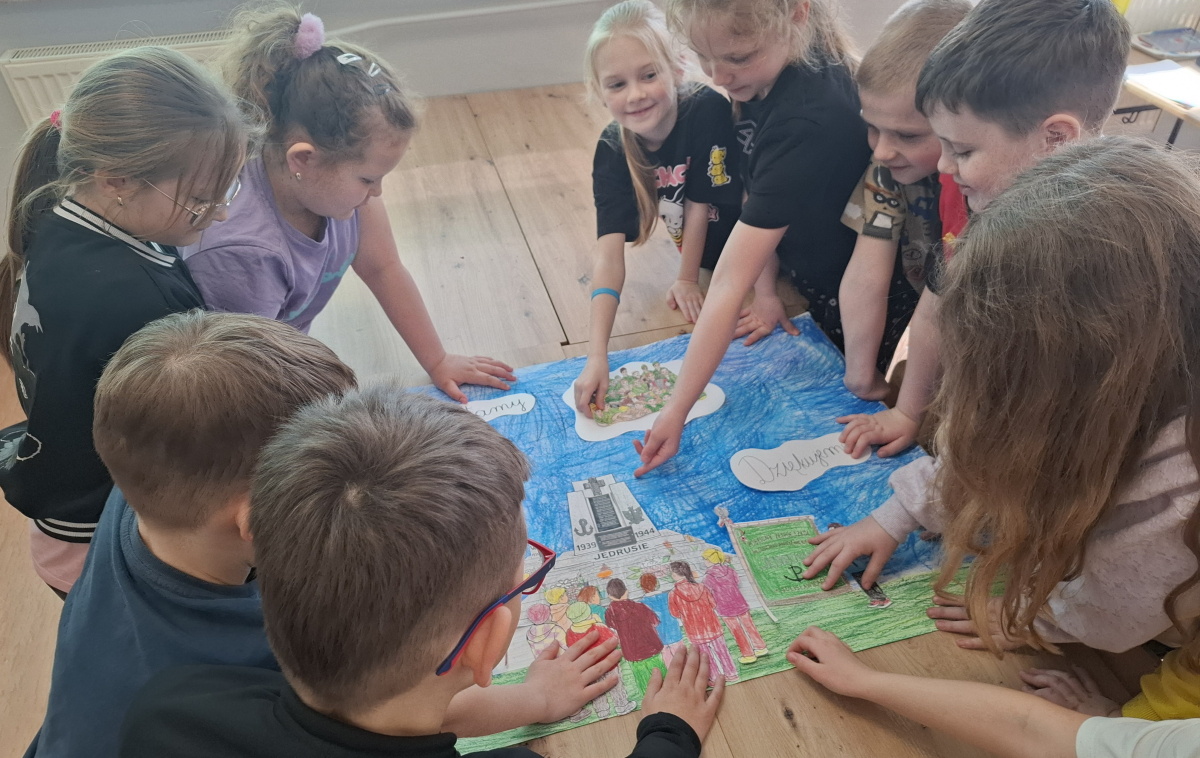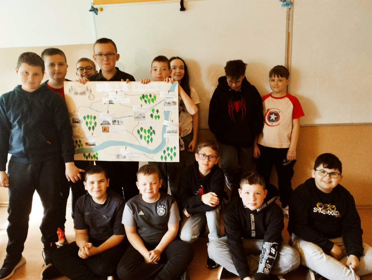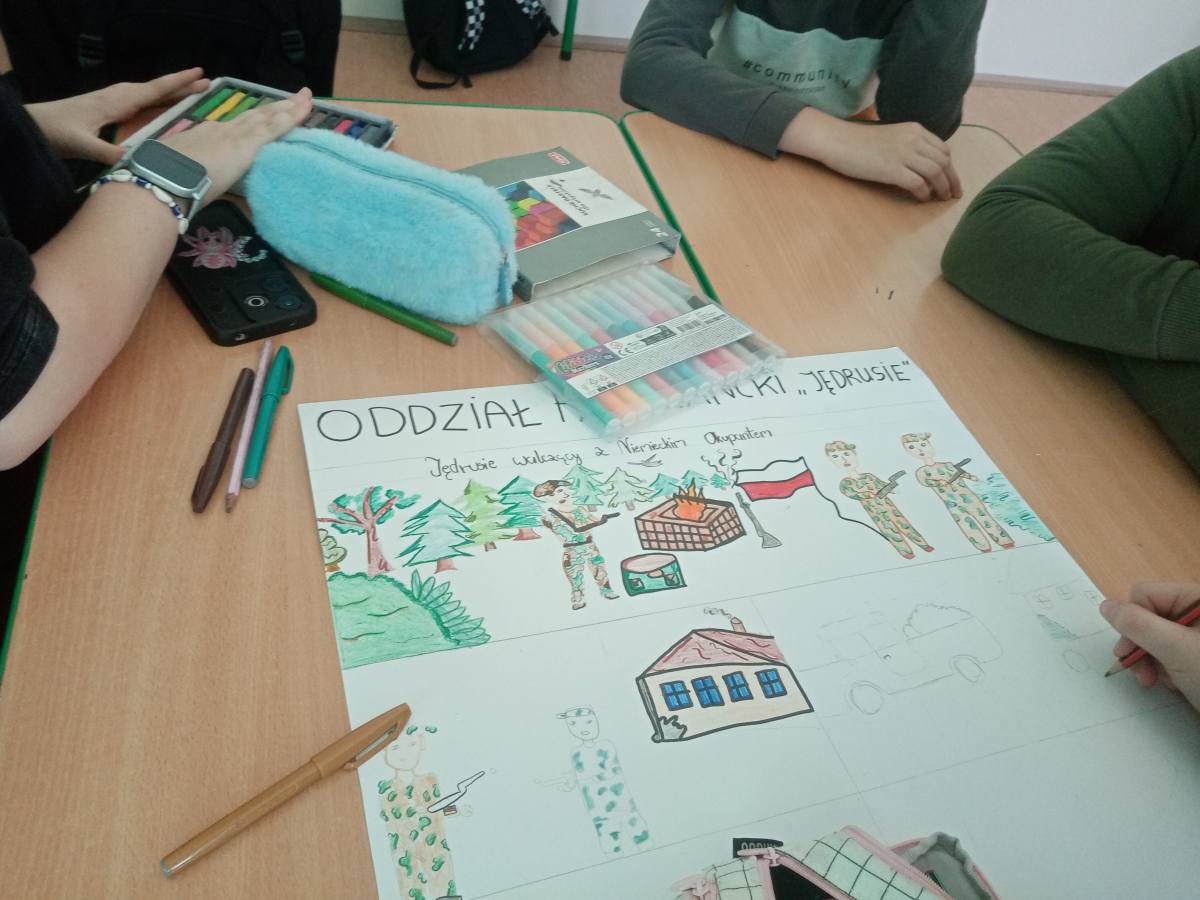 Klasa V zrealizowała zadanie pod hasłem „Jędrusie – historia zapisana na mapie”. Uczniowie, rysując mapę, poznawali miejsca związane z działalnością Jędrusiów, śledząc ich losy i najważniejsze wydarzenia. Dzięki temu mogli lepiej zrozumieć kontekst historyczny oraz znaczenie działań podejmowanych przez bohaterów, a także odkryć, jak historia łączy się z konkretnymi miejscami.