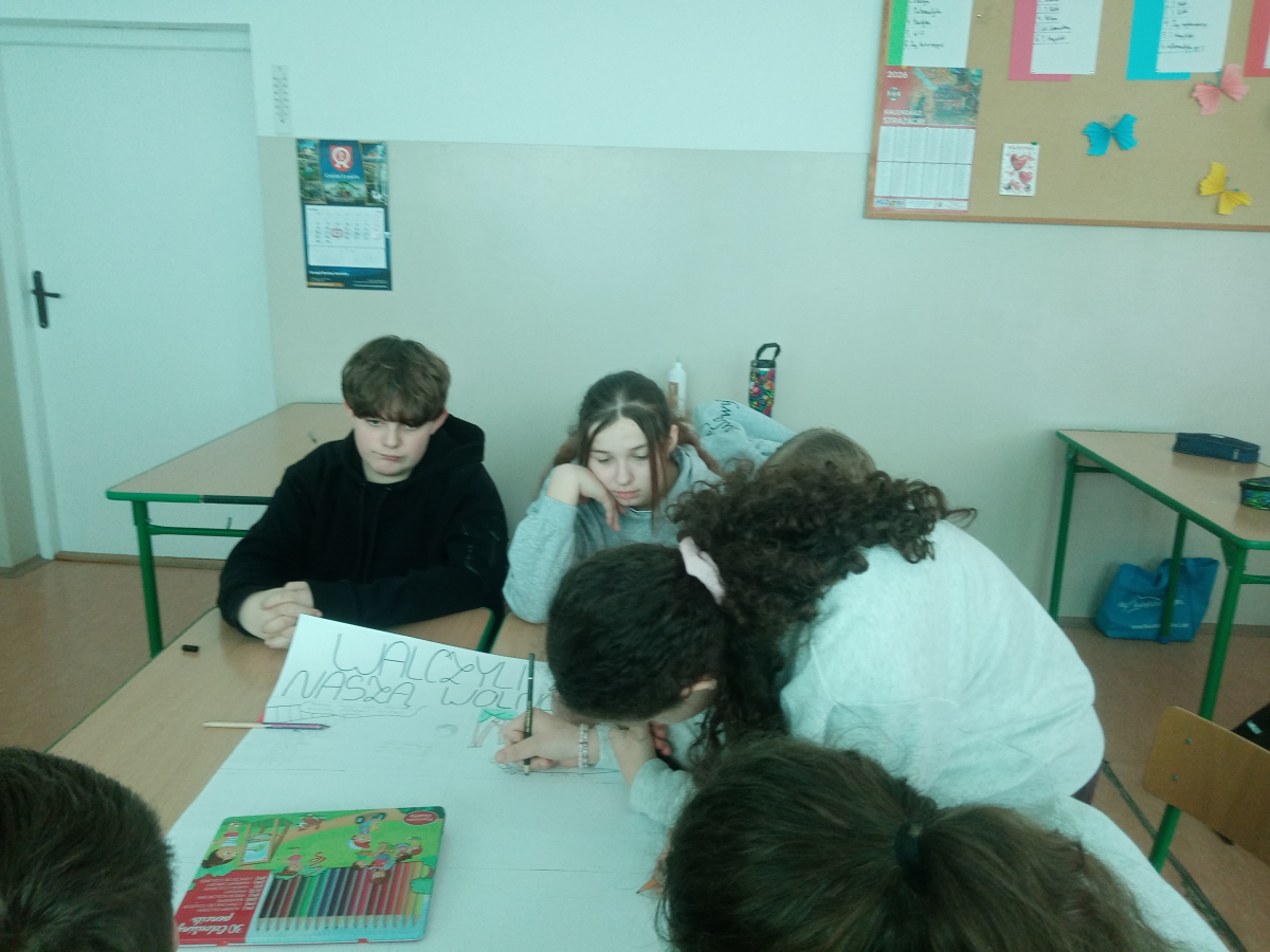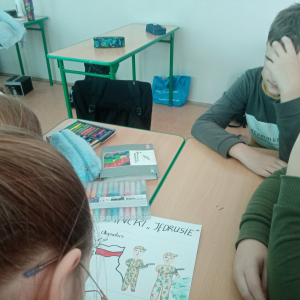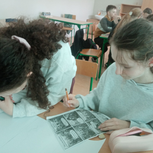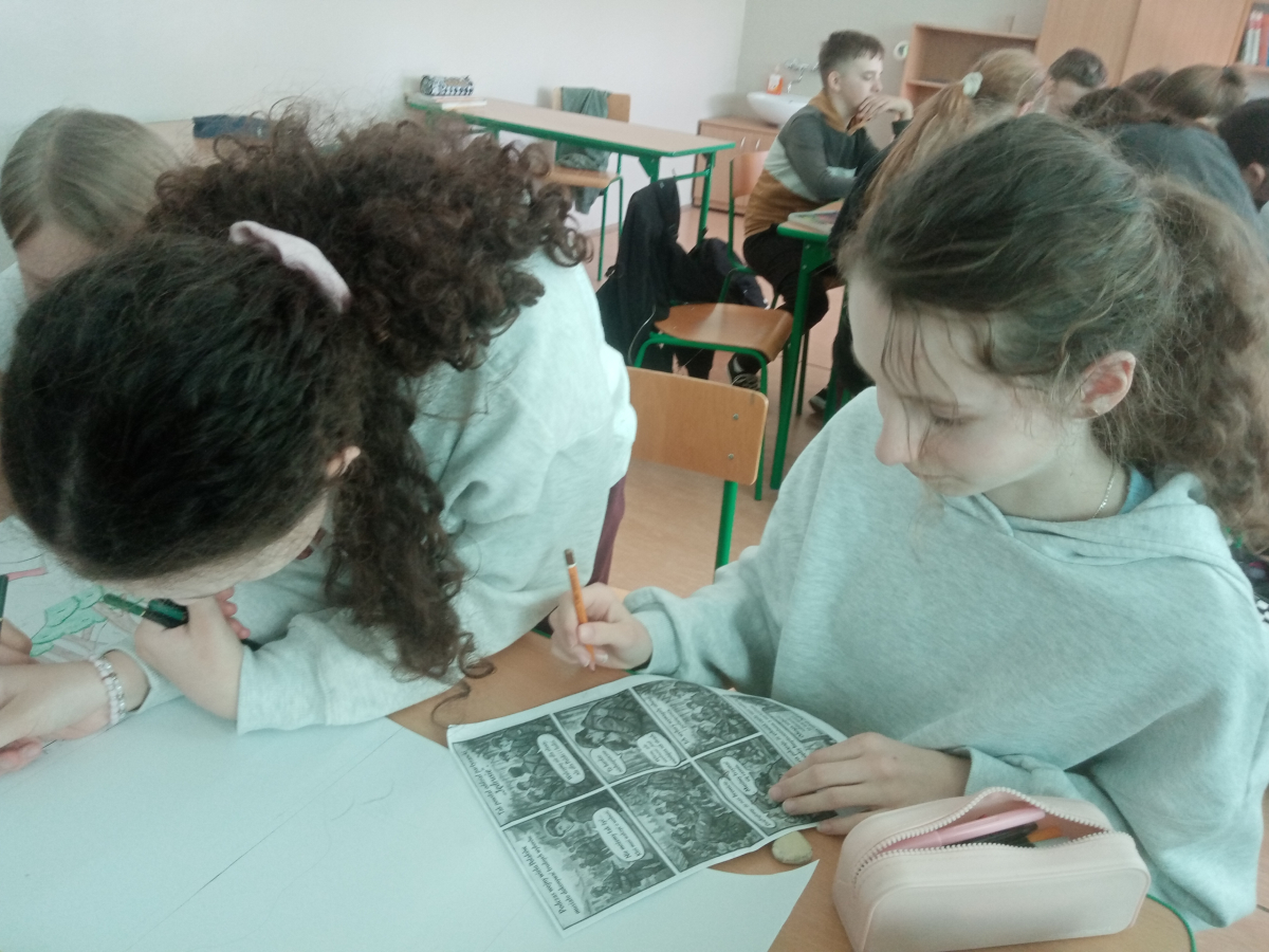 Klasa VI podjęła działania pod hasłem „Człowiek w historii – wartości i wybory.Bohaterowie codzienności”. Uczniowie, pracując w dwóch grupach, przygotowali krótkie komiksy przedstawiające scenki inspirowane prawdziwymi wydarzeniami. Ich prace ukazywały, jak w codziennych sytuacjach ludzie podejmują ważne czasami bardzo trudne decyzje i kierują się wartościami, które czynią ich prawdziwymi bohaterami. Często tym wyborom towarzyszyły emocje takie jak strach, gniew, radość.