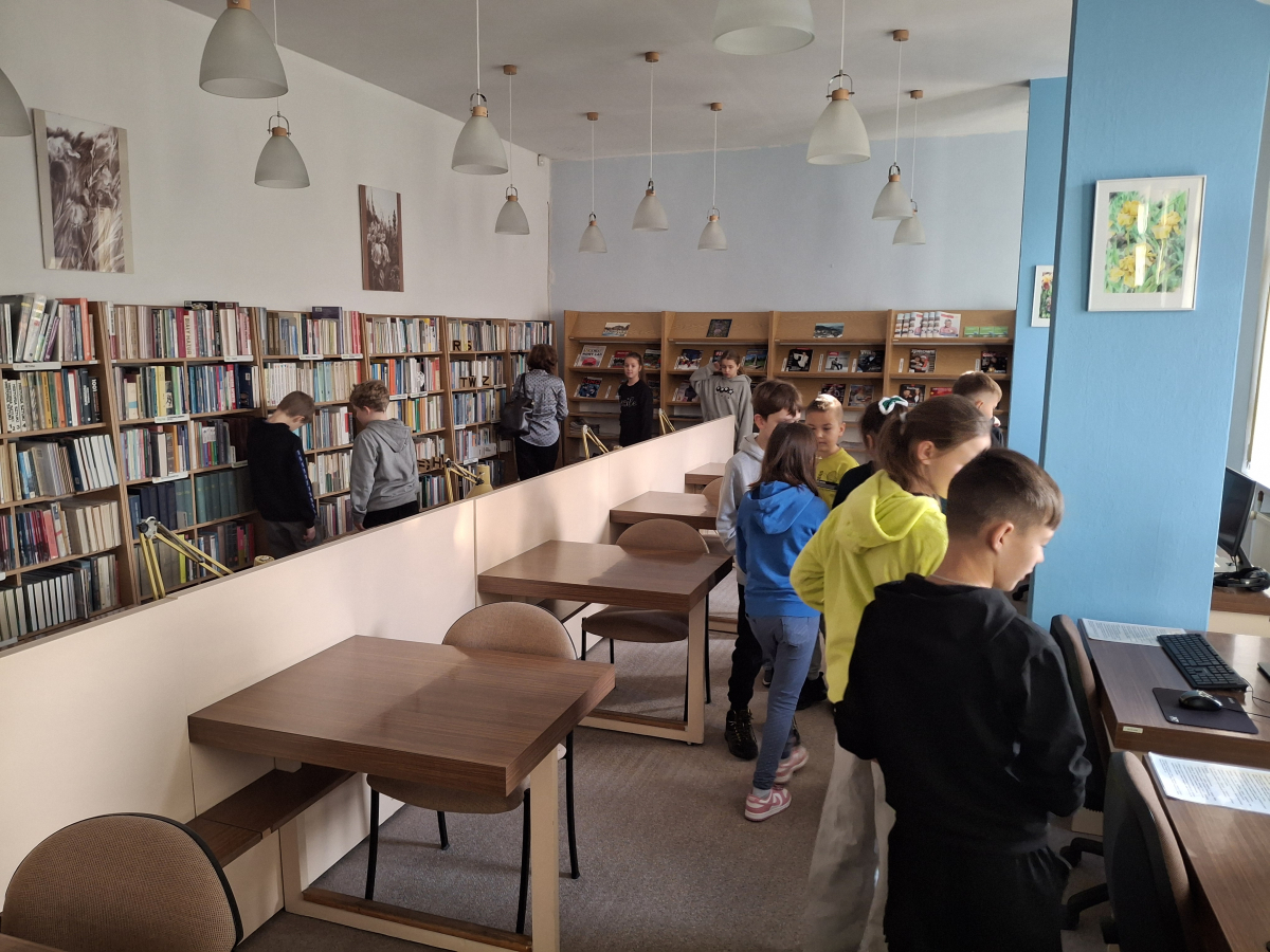 Uczniowie bardzo miło i serdecznie zostali przyjęci przez Panią Bibliotekarkę, która opowiedziała o pracy bibliotekarza oraz zaprosiła dzieci do zwiedzania „ DZIAŁU DLA DZIECI I MŁODZIEŻY”. Uczniowie mogli samodzielnie chodzić między półkami z księgozbiorem i wybrać sobie książkę, jaka ich interesuje. Kolejnym punktem zwiedzania była „WYPOŻYCZALNIA DLA DOROSŁYCH”, następnie „CZYTELNIA”.